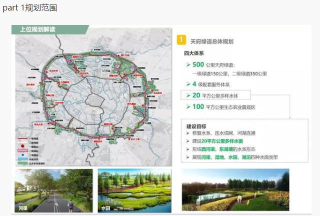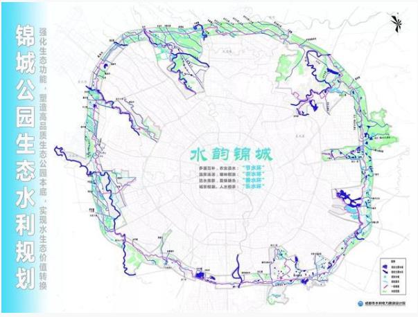 根据《天府绿道总体规划》,规划建设20平方公里多样水体、100平方公里生态景观农业区。建设目标是修复水系、连水成网、河湖连通,形成西河渠、东湖塘的水系形态,展现河渠、湿地、水田、湖泊四种水面类型。《2020年环城生态区总体规划优化提升》中对锦城公园生态要求为厚植生态本底,构筑水网格局。
