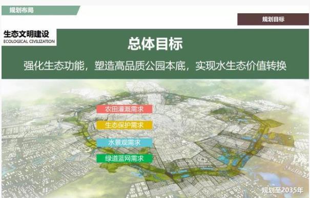 在统筹考虑生态文明建设中农田灌溉需求、生态保护需求、水景观需求、绿道蓝网需求的基础上,《规划》提出总体目标为强化生态功能,塑造高品质公园本底,实现水生态价值转换,高品质呈现“绿道蓝网、水城相融、清新明亮”的生态城市格局。