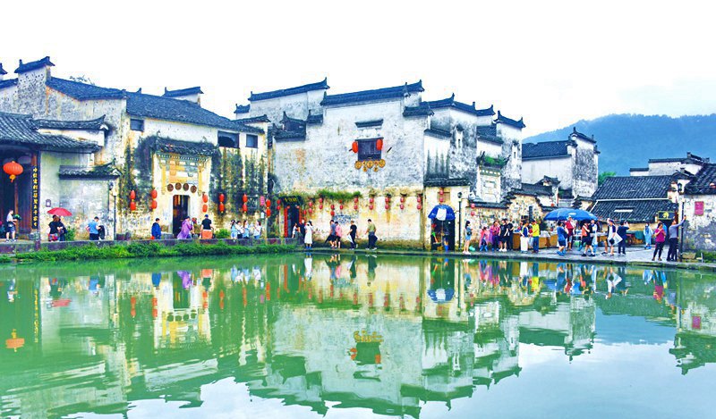 资料照片:游客在黄山市黟县宏村月沼游玩。 记者 潘成 摄